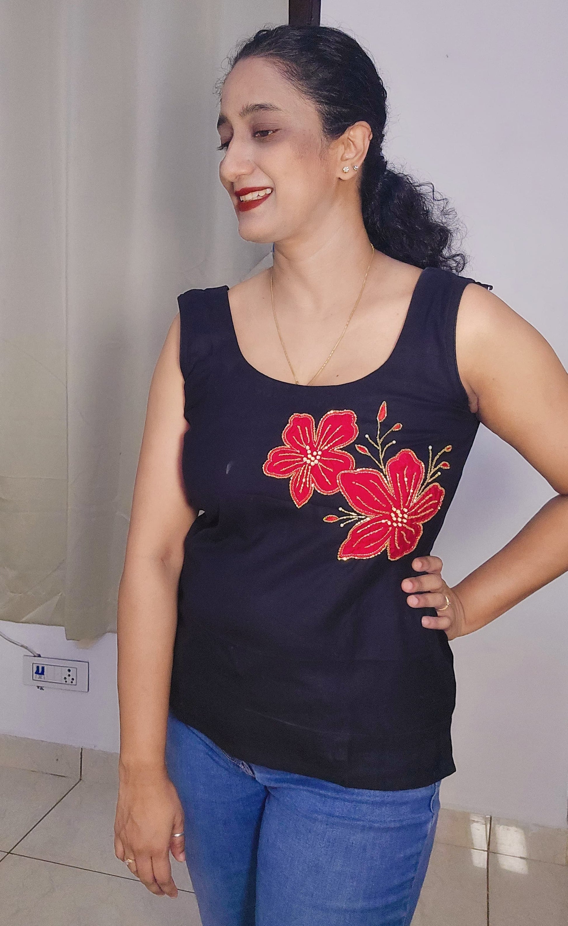 Elevate your everyday elegance with our Pushpika Appliqué Top — a perfect balance of comfort and artistry. Crafted in pure cotton, this sleeveless black top features hand-appliquéd red blossoms adorned with delicate cut-daana embroidery, adding a subtle festive shimmer.
